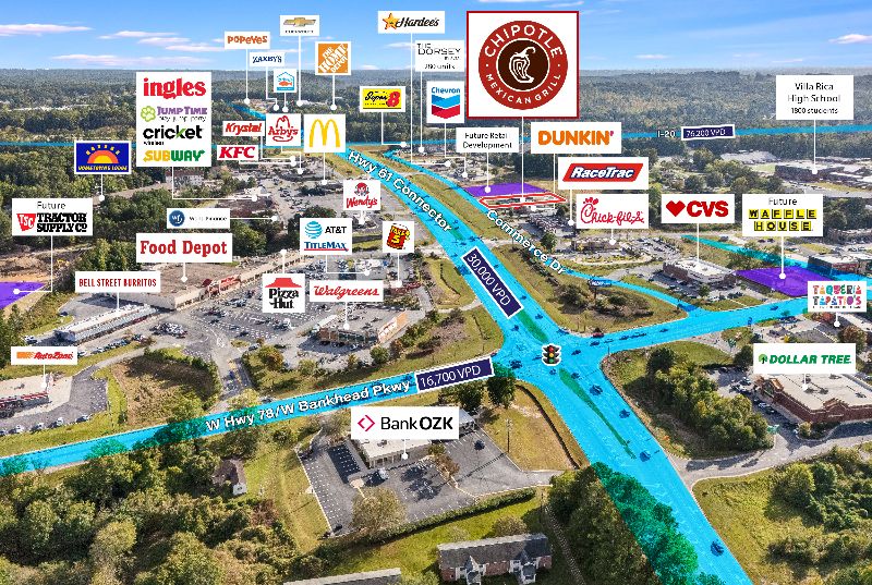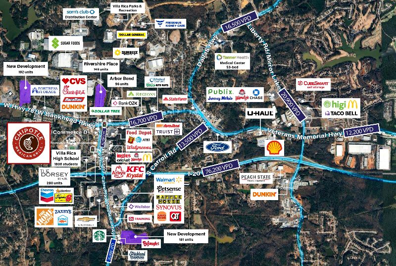 147 Commerce DrVilla Rica (Atlanta), GA 30180 Chipotle Offering Summary Price $3,917,000 Cap Rate 4.85% NOI $190,000.00 Rentable SF 2,325 SF Lot Size 33,541 +/- SF Year Built 2025 Lease Type Absolute NNN Lease Term 15 Years Investment Highlights Brand New 2025 Construction with Drive-Thru 15-Year Absolute NNN Lease with 10% Increases Every 5 Years Corporately Guaranteed by Chipotle (NYSE: CMG) Traffic Counts Exceed 30,000 Vehicles Per Day Dense and Affluent Demographics — 125,000+ Residents Within 10-Miles with Average Household Income Exceeding $88,000 10% Expected Population Increase Over Next 5-Years, Reflecting Strong Residential & Commercial Expansion in the Area Please login or sign up to view offering memorandum Login Sign Up For More Information, Please Contact: John R WertzManaging Principal(619) 218-6427[email protected]